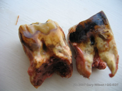 Picture of the two extracted teeth, blackening from periodontitis evident