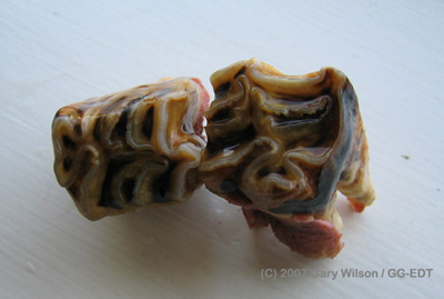 Picture of the two extracted teeth, the enamel/cementum/dentine folds are clear on the occlusal surfaces