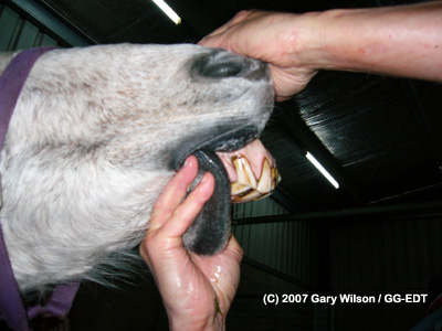 What was discovered when the horse was sedated, was some extremely long lower back teeth, which had grown so long the points were buried in the soft tissue of the upper jaw, which explains why the horse ate little and very gingerly. It also explained the overbite that had developed on the molars and was showing on the incisors.